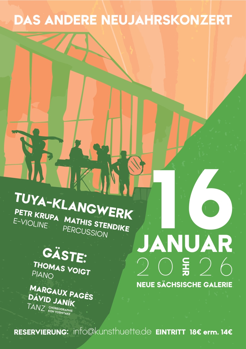 DAS ANDERE NEUJAHRSKONZERT ist nun schon eine gute Tradition. Tuya-Klangwerk begrüßt gemeinsam mit besonderen Gästen das Neue Jahr. Am 16. Januar, 20UHR26 haben sich Petr Krupa und Mathis Stendike den Komponisten und Klangkünstler Thomas Voigt am Klavier und die TänzerInnen Margaux Pagès und Dávid Janík eingeladen. Neben vielen klanglichen und getanzten Überraschungen wird auch eine Choreographie von Koh Yoshitake zu erleben sein. Natürlich gibt es wieder vegane Speckfettbemmen in der Pause - genau der richtige Start ins Neue Jahr! Eintritt: 18 € / erm. 14 €Kartenreservierungen sind möglich unter: info@kunsthuette.de