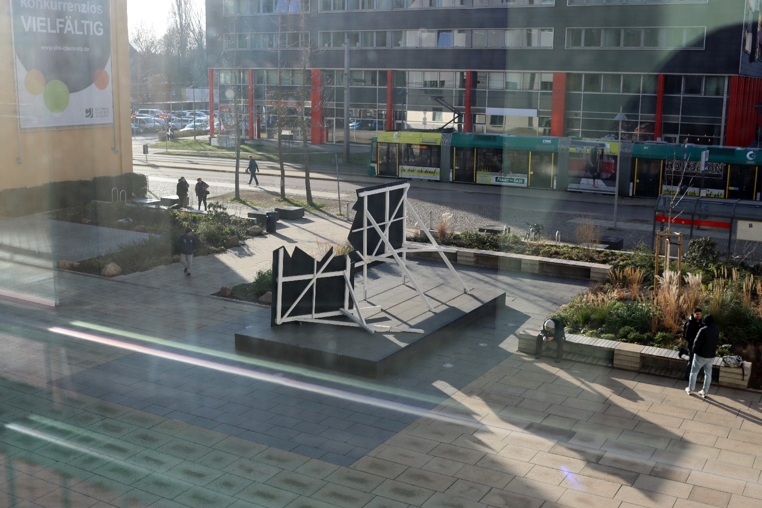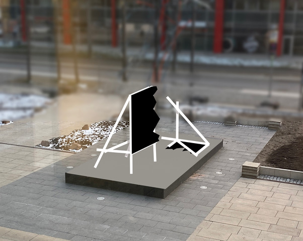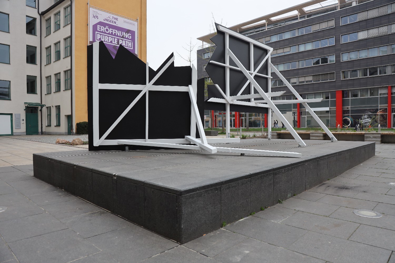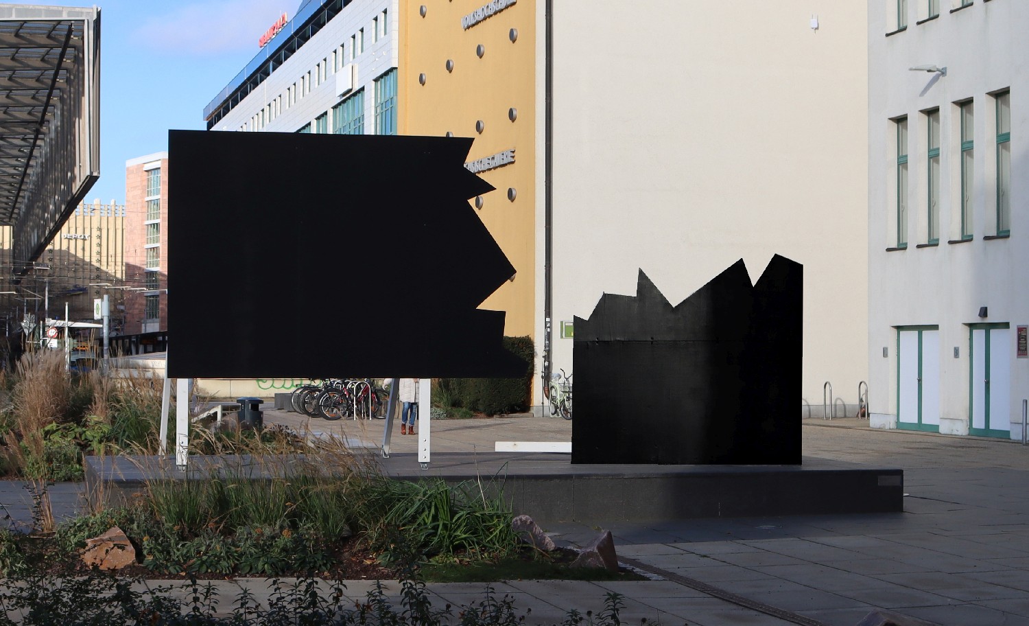Der französische Künstler OX errichtete auf einem freigewordenen Kunstsockel vor dem Kaufhaus Tietz eine zerbrochene Werbefläche. Aus der Hauptlaufrichtung kommend, fällt der Blick auf die zum grafischen Ereignis entwickelte Rückseite. Der neugierige Blick auf die Vorderseite gibt der Leere des typischen Werbeinhalts ein Bild.