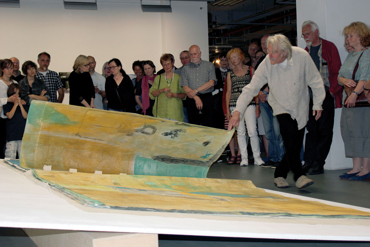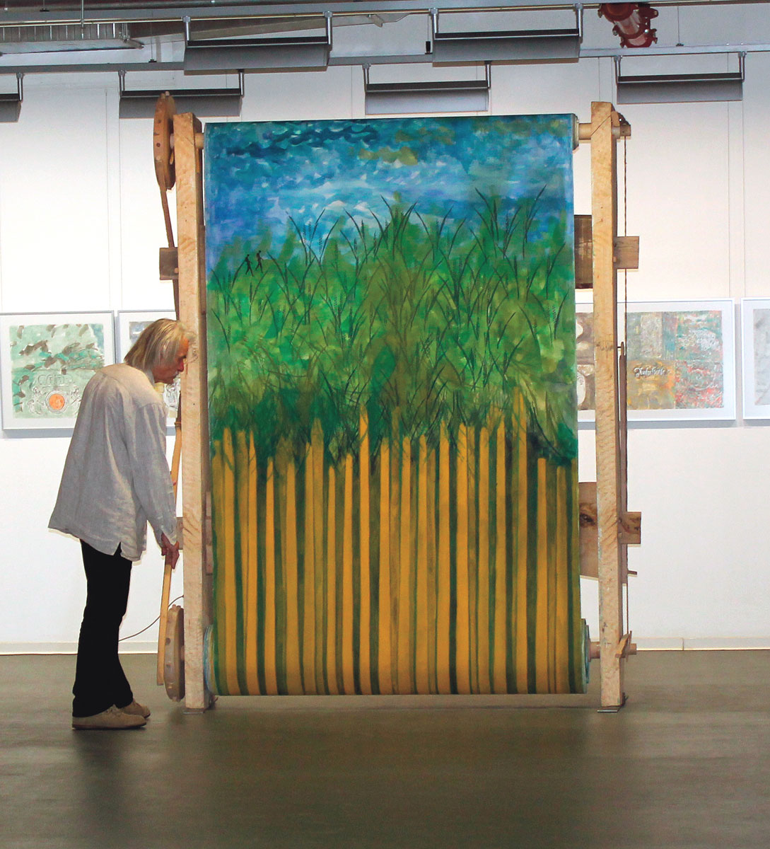 Zweimal durchquerte Olaf Wegewitz in den letzten Jahren Deutschland zu Fuß, entlang des 11. Längengrades zwischen Fehmarn und der Zugspitze und entlang des 51. Breitengrades zwischen Geilenkirchen und Görlitz.Es wurden Wanderungen mit aufmerksamer Zuwendung zu den Details der Natur wie der Verwandlung der Landschaft durch Kultivierung und intensive wirtschaftliche Nutzung aus der Nahsicht des Fußgängers. Zeitspuren vieler Generationen an einem Ort zeigten sich. Aber auch der reiche Wandel der Landschaft Deutschlands vom flachen Meer, durch eiszeitliche Prägeformen, über die Mittelgebirge bis hin zu den Alpen wurde registriert und in Bildformen übersetzt. Der Anstrengung täglicher Fußmärsche um die 40 Kilometer entsprachen einfache sprachliche Notizen und Abreibungen interessanter Objekte am Wege. Später entstanden Studien zu den Landschaftseindrücken und kulminierten nach der ersten Wanderung in einem 100 Meter langen Rollbild der Landschaftsabwicklung von der See bis ans Gebirge. Die zweite Wanderung mündete in ein zwei mal zwei Meter großes Buch, das Text und Bildeindrücke kombiniert.Die Ausstellung zeigt Fotos, die Sohn Lienhard, der Begleiter auf beiden Wanderungen, aufgenommen hat. So kann die Ausstellung mit viel anschaulichem Material die Wege nachvollziehbar machen und die Ideen der Bilder leichter verständlich werden lassen. Ein Katalog dokumentiert das Material der ersten Reise.Biografie:1949 geboren in Schönebeck I 1966 bis 1971 Lehre und Tätigkeit als Traktorenschlosser I 1968 Bekanntschaft mit Gil Schlesinger I 1971 bis 1975 Plakatkleber in Leipzig I 1974 bis 1975 Materialstudien bei Prof. Hans Schulze I Bekanntschaft mit Frieder Heinze I seit 1975 freiberuflich als Maler und Grafiker I seit 1983 Papierherstellung aus Pflanzenfasern, Aufbau einer Werkstatt in Huy-Neinstedt I seit Anfang der 90er Jahre Bienenhaltung, Obstbau und Pflanzungen, Beschäftigung mit Natursoziologie, dem Verhältnis zwischen Natur und menschlicher Kultur, Mikrokosmos I 1995 Beginn der Arbeit am Erbauungsbuch der Anna Ebin I 1996/97 drei Altarbilder für die Johanniskirche in Halberstadt I Erwerb eines 5 Hektar großen Areals mit Steinobstbeständen und aufgelassenen Gebäuden, das seit 1989 zu einer Symbiose zwischen Menscheninteresse und Naturinteresse gebildet wird. Studien zu Ruderalgesellschaften und Beginn an »Skulptur Gewächshaus«, gemeinsam mit Johanna Bartl und Wieland Krause I 1997 Holzmadenbuch. Zeichnungen Ablagerungen im Posidonienschiefer I Arbeiten zur Bewegung in der Natur und deren Verhältnis zur Technik Kupferkästen mit Radierungen und Zeichnungen I 1999 Kunstpreis des Landes Sachsen-Anhalt und »Kulturenwechsel« I Arbeiten zur Walderweiterung im Huy, Beginn der Arbeit »Herbarium« - große Zeichnungen zum Naturleben I 2000 Weiterarbeit »Nanna, die Beseelung der Pflanzen« - zum Gedenken an G. Th. Fechner I 2001 »Respektiertes Areal« für freie Areale der Natur beginnt Gestalt anzunehmen, Radwanderungen zu »Gesteine«, »Walther von der Vogelweide im Nonnengarten« I 2002 Sammlung von Pflanzenschatten in Oggiogno I 2004 Arbeit zu Maria Sybilla Merian I 2005/2006 »Klopstockquelle – Ein Spaziergang«, Ausstellung im Gleimhaus Halberstadt I 2009 »geradewegs« Wanderung von Fehmarn zur Zugspitze I 2011 Installation »Respektiertes Areal« in den Klostergärten in Drübeck I 2012 Gaststipendium FAMAKunststiftung Ahrenshoop I Wanderung »quer« von Geilenkirchen nach Görlitz I 2009 bis 2013 Rollbild «geradewegs« I 2015 Skulptur für Moritz Schlick in Rostock, Skulptur «Feldscheune« in Huy-Neinstedt I lebt und arbeitet in Huy-NeinstedtPlakate A1 Digitaldruck