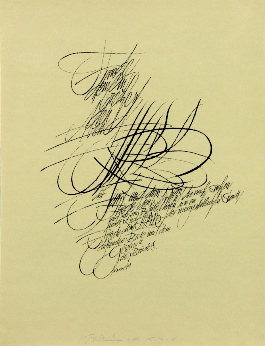 HEINZ SCHUMANN Born in Chemnitz in 1934, apprenticeship as a graphic designer, 1952-57 studied commercial art, book design, lettering and typography at the HGB in Leipzig under Albert Kapr, Wolfgang Mattheuer and Hans Mayer-Foreyt. Until 1959, he worked as a graphic designer at DEFA-Synchron Berlin-Johannisthal and was a guest lecturer on typefaces at the Technical College for Advertising and Design in Berlin-Schöneweide. 1959-62 master student under Albert Kapr, special training in the production of typographic fonts, graphic designer at the Freie Presse in Karl-Marx-Stadt, since 1962 member of the professional association VBK-DDR, since 1966 freelance in Chemnitz, 1971 Fatherland Order of Merit in bronze after the realisation of the lettering wall behind the Marx monument, design of several typesfaces and sculptural lettering designs in connection with architecture, 1989 Silver medal at the International Book Art Exhibition in Leipzig, 2004 Grand Prize for International Calligraphy, Westerlo (Belgium), lifelong engagement with calligraphy, written with brush, reed pen and goose quill, worldwide exhibition participation, works in the Book and Writing Museum of the German Library in Leipzig, the collection of contemporary calligraphy of the Academy of Arts in Berlin, the New Saxon Gallery in Chemnitz and in private ownership, died in Chemnitz in 2020.