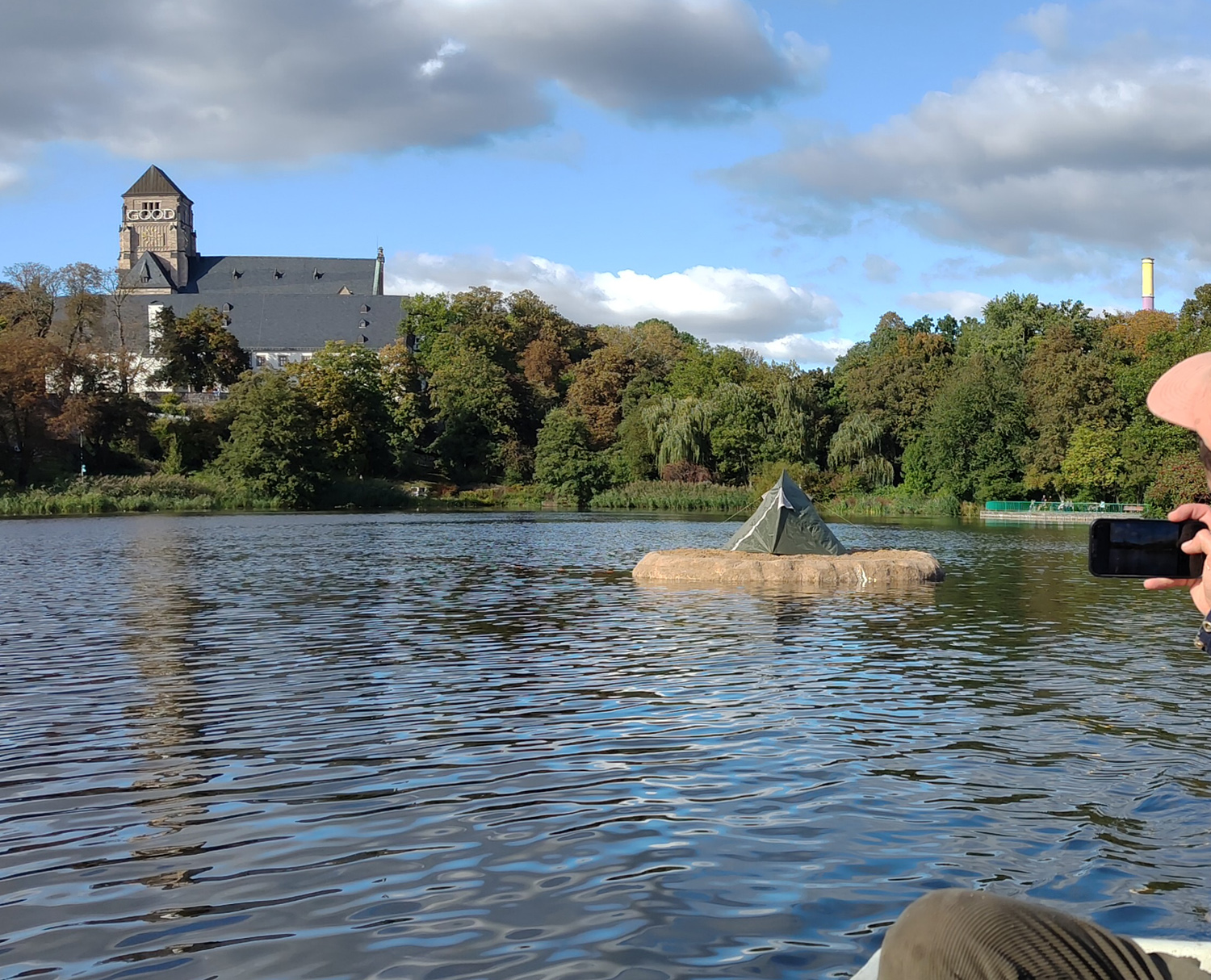Due to the temporary nature of the project, only a few works will still be on display in the city at the end of 2025: the razor on Marxkopf, the island on the castle pond and the broken advertising wall in front of the Kulturhaus Tietz.