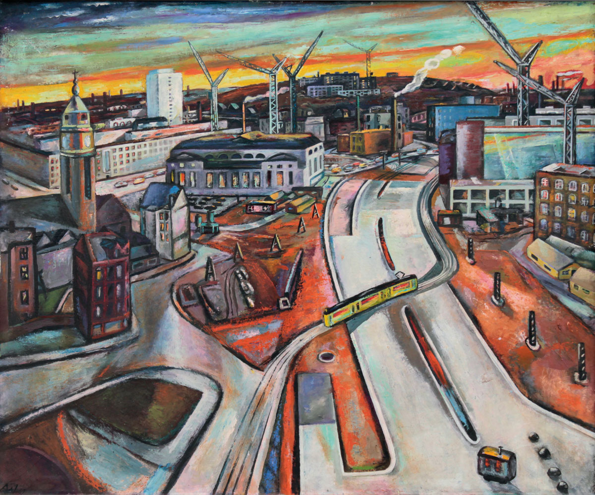 Das Bild einer Stadt wandelt sich ständig. Gerade Chemnitz hat durch die Zerstörung im Zweiten Weltkrieg und den Wiederaufbau großer Bereiche der Innenstadt sein Gesicht sehr stark verändert. In der Sammlung der Neuen Sächsischen Galerie befinden sich zahlreiche Werke, auf denen Chemnitzer Künstler das Bild und die Atmosphäre ihrer Stadt und ihrer Bewohner aus verschiedenen Perspektiven und zu unterschiedlichen Zeiten festgehalten haben.Die frühesten Arbeiten stammen aus der unmittelbaren Nachkriegszeit und geben einen Eindruck von der schwierigen Ausgangssituation nach 1945. Die folgenden Jahre waren geprägt vom Wiederaufbau im Zeichen des Sozialismus. Überall drehten sich die Baukräne und es entstanden jene bis heute existierenden breiten Straßen. Das Zentrum sollte mitGroßprojekten, wie dem Bau der Stadthalle und des Hotelhochhauses ein völlig neues, großstädtisches Aussehen bekommen. An der Peripherie wurden gewaltige Wohnungsbauprogramme umgesetzt. Die mehrstöckigen Wohnblöcke, errichtet in Plattenbauweise, verschafften vielen Menschen eine zeitgemäße Unterkunft mit Zentralheizung und Warmwasser. Erstaunlicherweise fand dieser Fortschritt nur wenig künstlerischen Widerhall, höchstens mit ironisch-satirischen Untertönen wie in Uwe Bullmanns „Sonntagmorgen im Neubaugebiet“. Mit der großflächigenRekonstruktion von Gebäudezügen auf dem Sonnenberg, nahm man sich Mitte der 80er Jahre endlich auch eines Altbauviertels an. Der Fotograf Kieu minh Viet hat diesen Prozess mit drei umfangreichen Fotoserien detailreich dokumentiert.All diese Prozesse führten zu einer eigenwilligen städtebaulichen Durchmischung von Altbausubstanz und Neubauvierteln, von Verkehrswegen und Industrieanlagen. Zahlreiche Künstler wandten sich den vernachlässigten Vierteln und den eher „malerischen“ Ecken zu. Bröckelnde Gründerzeitfassaden, zugewachsene Hinterhöfe, marode Fabrikanlagen – alles relativ menschenleer und grau – vermitteln vielmehr das Bild einer schlafenden Kleinstadt als daseiner pulsierenden Großstadt.
