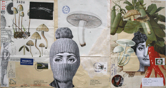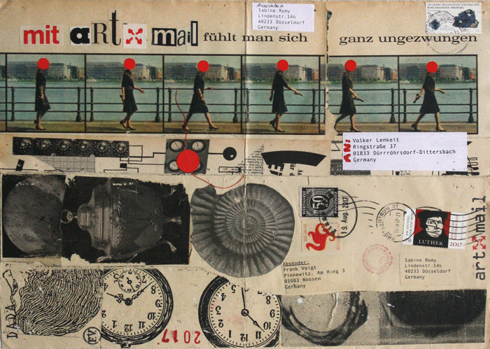 Mail Art bricht den Mythos vom einsamen Künstler im Atelier. Sie führt im Namen, was des Pudels Kern ist: ihre Kommunikationsfähigkeit macht die Kunst. Sie ist ein besondrer Saft, die Ausstellung zeigts in aller Deutlichkeit: Der künstlerische Impuls kommt aus dem Spiel, aus dem wetteifernden Austausch, der Erwartung einer Reaktion und der Freude am Vorgang als solchem. Die beiden hier vorgestellten Projekte COLLABORATION (2018ff.) und artXmail (2013-16) dehnen die Kommunikation zeitgemäß bis an die Ränder der Welt. Beiträge von mehr als fünfzig KünstlerInnen rund um den Globus prägen die Arbeiten. Die Spielregeln legten die jeweiligen Initiatoren fest - über die Form der Antworten oder das Dehnen der Regeln entschieden die Partner. Die Ausstellung zeugt von einem überbordenden Vergnügen an solcher bildhaften Kommunikation, von Zufällen äußerer Kräfte auf dem Postweg und wirkt zutiefst ansteckend auf die Betrachter. Einen grundlegenden Unterschied zur klassischen Kunst kennzeichnet die Mail Art: sie agiert (bisher) jenseits des Marktes, ja sie pflegt (bisher) sogar eine ausdrückliche Distanz zum Markt. Diese Situation sichert ihr den spielerischen Charakter und die Experimentierfreude. Mit der Marktferne verliert die Korrespondenzkunst, wie sie von Ray Johnson, dem Begründer der Mail Art ursprünglich (New York, 1970) genannt wurde, auch das Abgrenzungsbedürfnis und den elitären Charakter. Einfachste Techniken wie Collage und Schnitte, Kopierverfahren und Montagen kommen zum Einsatz, alle verfügbaren Materialien und vorhandene Bildwerke wie Zeitungsausschnitte, Stempel oder Postkarten werden kombiniert. Qualität entsteht aus geistiger Offenheit gepaart mit assoziativer und gedanklicher bildnerischer Tiefe, aus Spontanität und gestalterischem Geschick und der Fähigkeit, Raum für den antwortenden, weiter denkenden Partner zu erkennen und zu belassen. Mail Art ist per se unvollendet. Mail Art ist Denk-Kunst. „Ich sende Ihnen einen Gedanken zu. Bitte denken Sie ihn weiter.“ (Robert Rehfeldt) Der Postweg machts möglich: Hinter den Beiträgen verbergen sich künstlerische Identitäten und gelegentlich auch virtuelle Personen, die damit eine Form früher Netzwerkkunst hervorgebracht haben, die eine kunsthistorische Brücke zur heutigen Internetkunst schlägt. Die drei sächsischen KünstlerInnen Petra Lorenz, Frank Voigt und Volker Lenkeit betätigen sich seit vielen Jahren im Metier der Mail Art. Neben der Fähigkeit zur Initiative und Ideensetzung, auf die die eingeladenen Künstler reagieren können, zeigen sie einen ausgesprochenen Sinn für Logistik, die Organisation komplexer Vorgänge, sind kontaktfreudig über die sozialen Medien und wirken mit ihrer Begeisterung ansteckend. Fast jede geistige Herausforderung des Alltagsleben kann zu einem Thema des Austausches werden, zu Mail Art gerinnen. Das artXmail hat über die Jahre mehr als 200 Beiträge weltweit hervorgebracht. COLLABORATION wird mitten im fortlaufenden Prozess vorgestellt. Dank einer großzügigen Schenkung wird ein Großteil der Werke des artXmail-Projektes in den Bestand der Sammlung der Neuen Sächsischen Galerie eingehen. Sabine Remy, eine der großen unter den Collage-KünstlerInnen, gehört zu den Aktivistinnen der COLLABORATION. Ihre "Ungleichen Zwillinge" nehmen zwei gleiche, "vor dem Papiercontainer gerettete" Bücher der Insel-Bücherei zur Grundlage. In Zusammenarbeit mit jeweils einem anderen Künstler beginnt jeder ein Buch zu gestalten und sendet es dem jeweils anderen zur Fertigstellung. Es entstehen "ungleiche Zwillinge". Frank Voigt: 1946 in Dresden geboren I 1965 Facharbeiterabschluss als Mechaniker I 1969 – 74 Studium an der Hochschule für Grafik und Buchkunst Leipzig, Diplom I seit 1974 freischaffend I 1992 Stipendium der Stiftung Kulturfonds Berlin I seit 1995 Computermontagen und Computervideos I 1997 – 2005 Lehrtätigkeit an der Berufsfachschule BEST SABEL in Freital I seit 2003 Projektionen/Fotografie I 1996, 2002 und 2012 Preisträger der Grafikbiennale 100 Sächsische Grafiken, Chemnitz I lebt und arbeitet in Pinnewitz Petra Lorenz: 1960 in Schwäbisch Gmünd geboren I 1987 - 1989 Studium der Kunstgeschichte in Augsburg und Tübingen I 1995 - 1997 Arbeit in der Baudenkmalpflege (Wandmalerei) I 1998 Umzug nach Dresden I 1999 erstes Computervideo „Traum“ I seit 2002 Mitglied im Neuen Sächsischen Kunstverein Dresden I 2003 Videoanimation „Tanz“ I seit 2005 Mitglied im Sächsischen Künstlerbund und BBK I lebt und arbeitet in Wünschendorf Volker Lenkeit: 1959 in Dresden geboren I 1982 - 1987 Studium Malerei/Grafik an der Hochschule für Bildende Künste Dresden bei Hubertus Giebe, Johannes Heisig, Gerhard Kettner, Ursula Rzodeczko, Diplom zu Thema Tanz (Lithografie) I ab 1987 freischaffend in Dresden I 1991 Mitgründer des Kunst- und Kulturvereins Alte Feuerwache Loschwitz e.V. I Aufbau der Lithografiewerkstatt im Kunstverein I diverse Kurse im Kunst- und Kulturverein Alte Feuerwache Loschwitz e.V., der Volkshochschule Dresden, im Kulturverein riesa efau