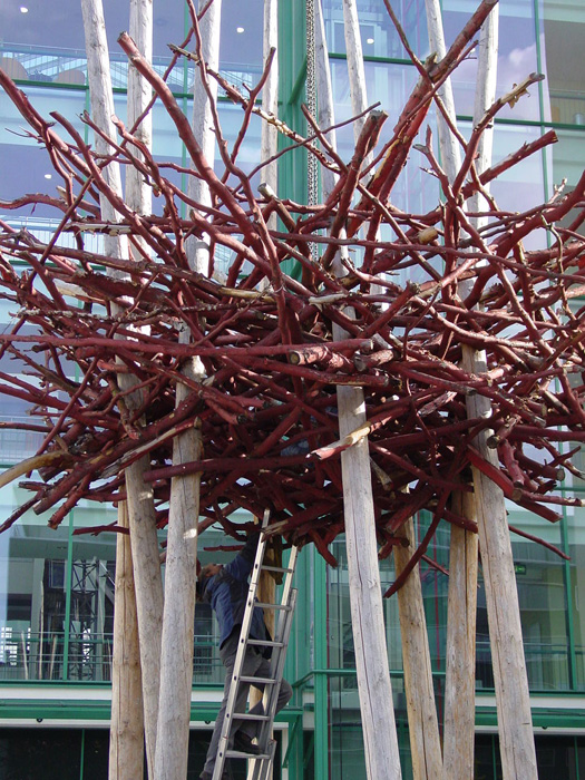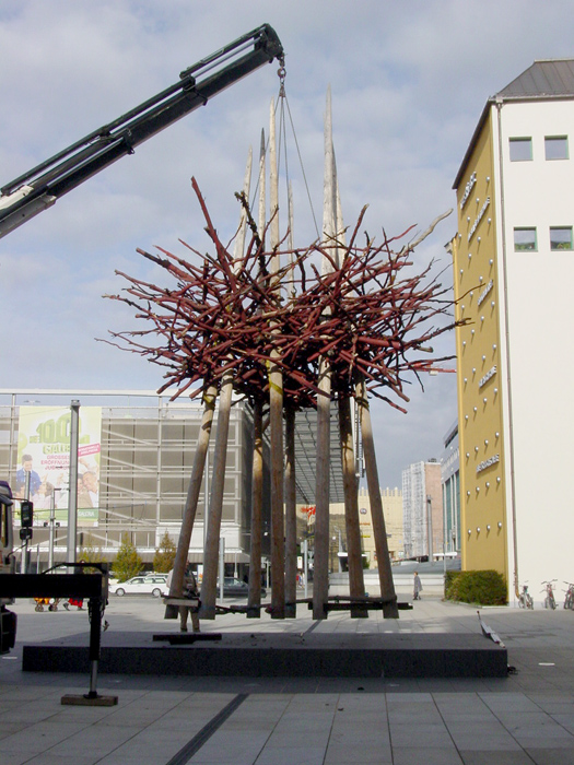 Höhe ca. 8m, farbig gefaßtes Fundholz, Rundhölzer Objekt auf dem Vorplatz des Kulturzentrums DAS TIETZ Chemnitz Aufstellzeitraum von Oktober 2004 bis September 2005,
