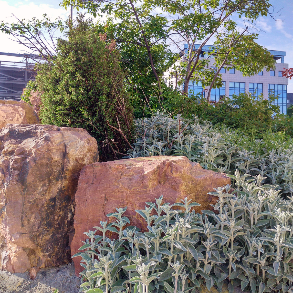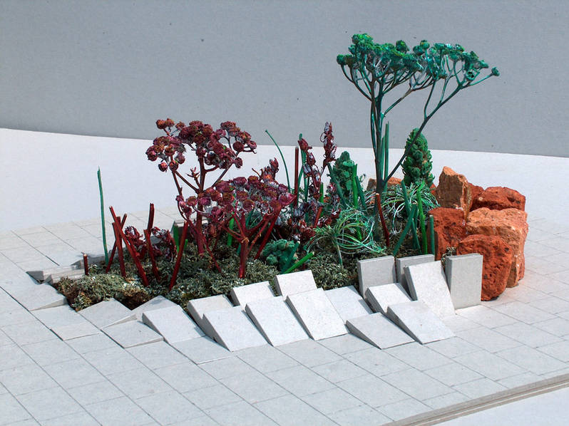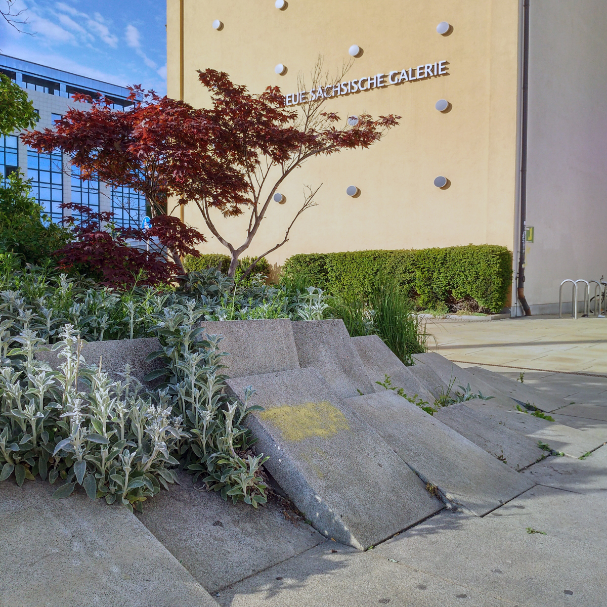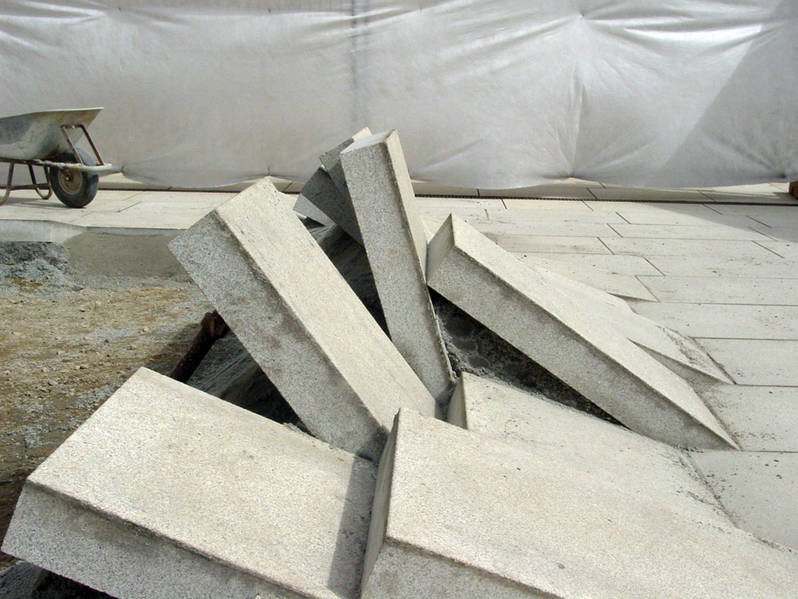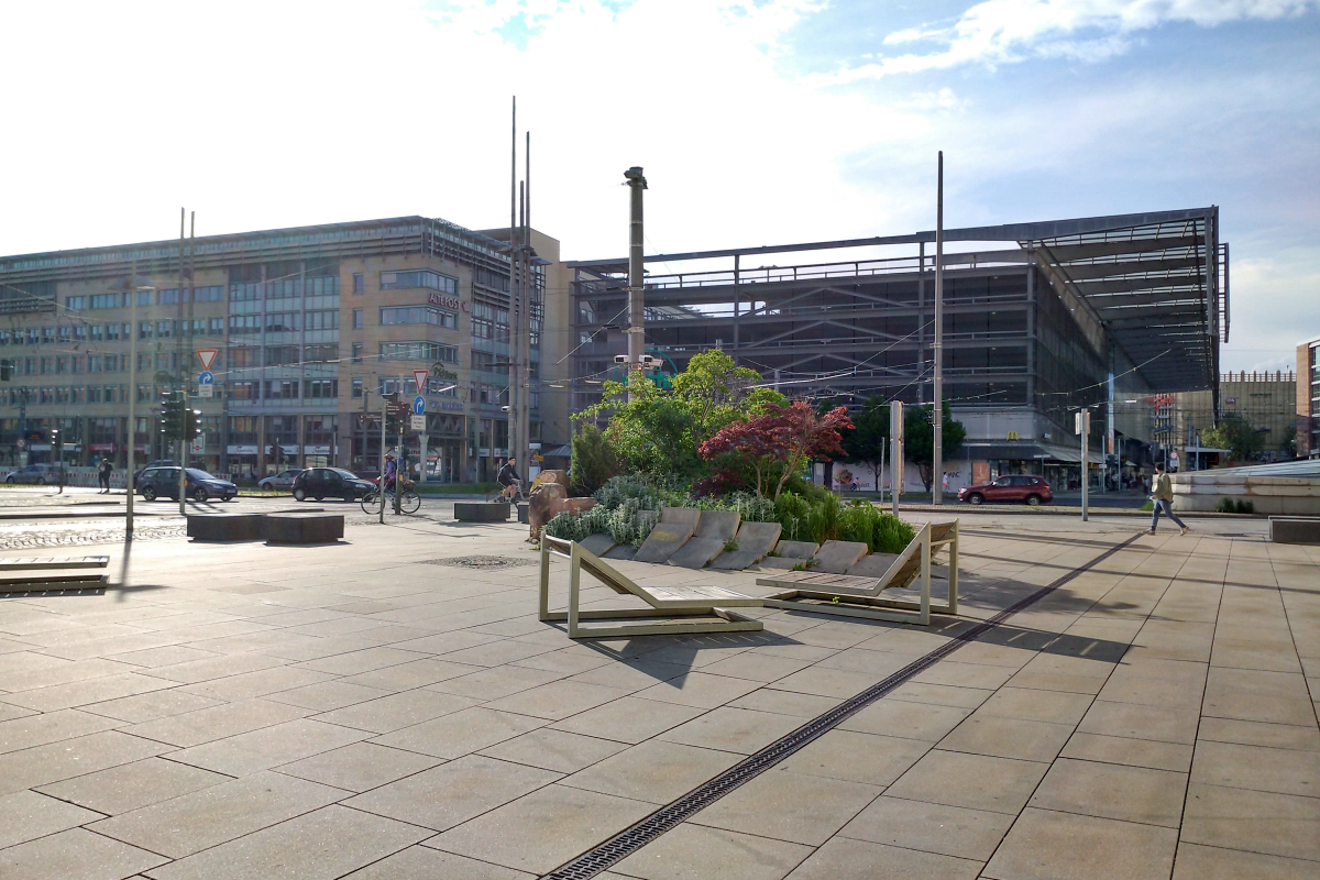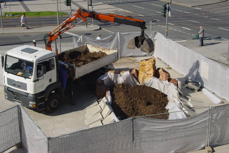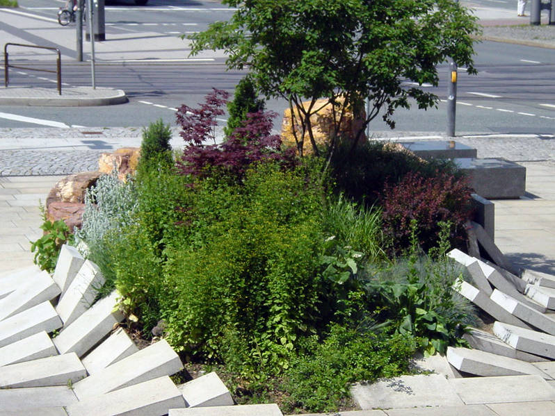 Aufbruch der Vorplatzfläche des Kulturzentrums Tietz in Chemnitz, Bepflanzung, Porphyrsteine, Grundfläche ca. 5 x 7 Meter