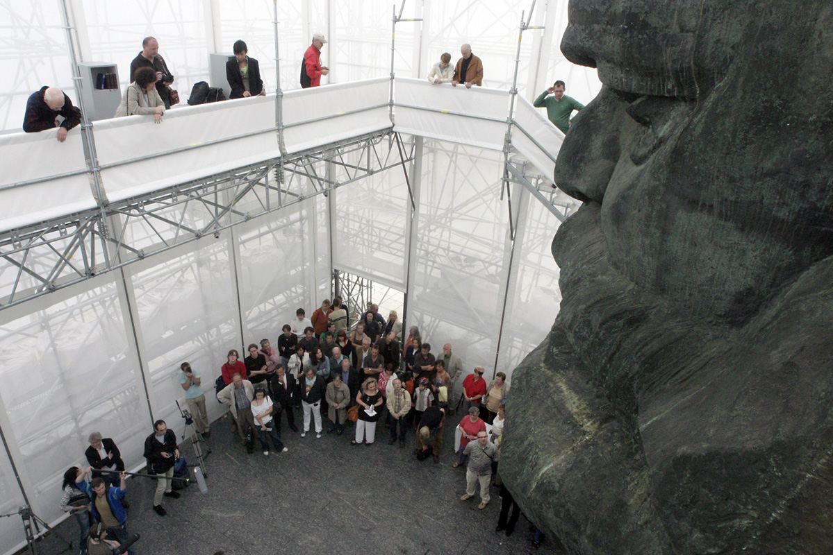 Das Objekt ist schon an Ort und Stelle. Nun kommt es ins Museum, indem ihm ein weißer Kubus von 17 x 12 x 30 Metern übergestülpt wird. Was wird aus dem berühmten Chemnitzer Kopf des Philosophen Marx, wenn er seines Entstehungskontextes beraubt wird, wenn der Betrachter hinter dem Indienstgenommenen den Philosophen wiederentdecken kann? Diese geistige Herausforderung an die Plastik und das Publikum zu erproben, unternimmt das Projekt.Innerhalb des begehbaren Kubus wird dem Besucher auf steigenden Wegen zunächst eine Wandlung der bisherigen Annäherung an den Marxkopf auf Augenhöhe ermöglicht. Den oberen Abschluß des Weges bildet eine Plattform über dem Kopf mit Aussicht auf die nun wieder sichtbare Stadt.Eine zweite Wirkungsebene des Projektes ist seine architektonische Form im Stadtraum. Der massive Eingriff an einem Schwachpunkt der städtebaulichen Entwicklung in unmittelbarer Nähe des Stadtzentrums von Chemnitz will einen Impuls für den Sächsischen Architektursommer 2008 geben.